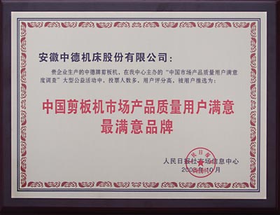 由人民日報(bào)社市場信息中心主辦、中國物流與采購聯(lián)合會、中國紡織工業(yè)協(xié)會、中國輕工機(jī)械協(xié)會等60多家權(quán)威行業(yè)協(xié)會、《工人日報(bào)》、《科技日報(bào)》等10家權(quán)威報(bào)刊、人民網(wǎng)及搜狐網(wǎng)等權(quán)威網(wǎng)站協(xié)辦支持,為期三個(gè)多月的“中國市場質(zhì)量用戶滿意度調(diào)查”大型公益活動(dòng)終于揭曉。我公司生產(chǎn)的中德牌剪板機(jī),在本次公益活動(dòng)中,投票人數(shù)多,用戶評分高,被用戶推選為:中國剪板機(jī)市場產(chǎn)品質(zhì)量用戶滿意最滿意品牌。