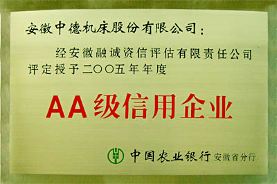 日前,經(jīng)安徽融誠資信評估有限責(zé)任公司評定,安徽中德機床股份有限公司再次被中國農(nóng)業(yè)銀行安徽省分行授予二00五年年級AA級信用企業(yè)。