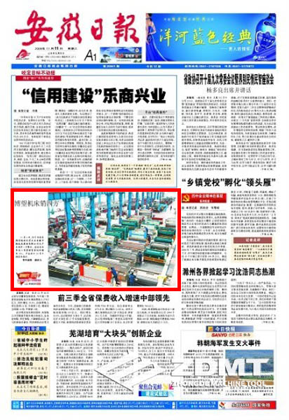 今日(2009年11月11日)《安徽日?qǐng)?bào)》頭版刊載《博望機(jī)床銷四方》的圖片新聞報(bào)道。在我公司大型車間圖片中,配出如下文字報(bào)道:11月6日,位于當(dāng)涂縣博望鎮(zhèn)的民營企業(yè)安徽中德機(jī)床股份有限公司生產(chǎn)車間里一片繁忙。該企業(yè)今年前三季度銷售量同比增長35%,產(chǎn)品出口30多個(gè)國家和地區(qū)。(特約攝影 謝富樂)